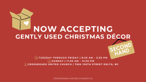 Crossroads United Church is now accepting gently used Christmas décor donations as we prepare for next year’s much-loved Christmas Décor & More Sale.