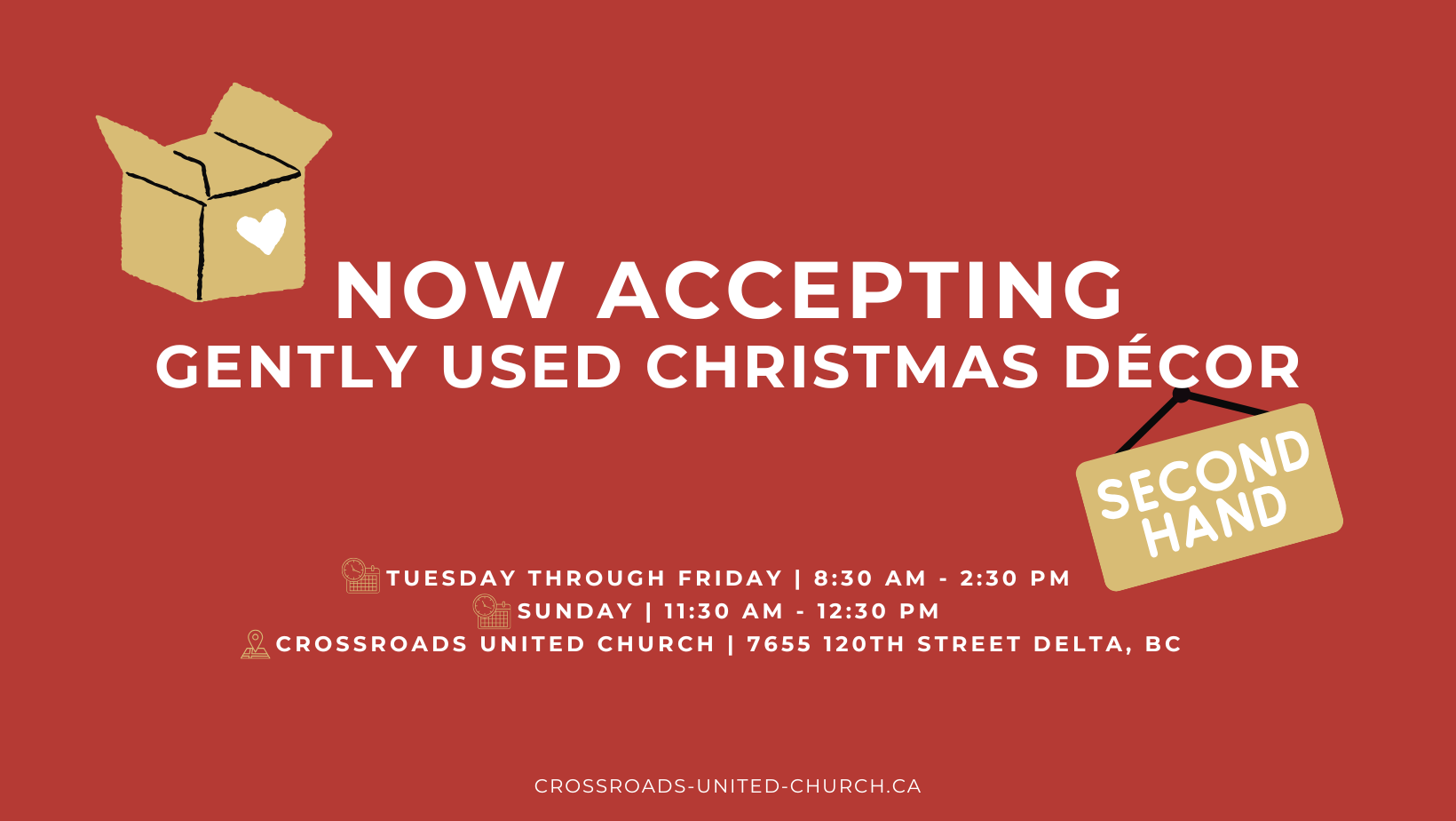 Crossroads United Church is now accepting gently used Christmas décor donations as we prepare for next year’s much-loved Christmas Décor & More Sale.